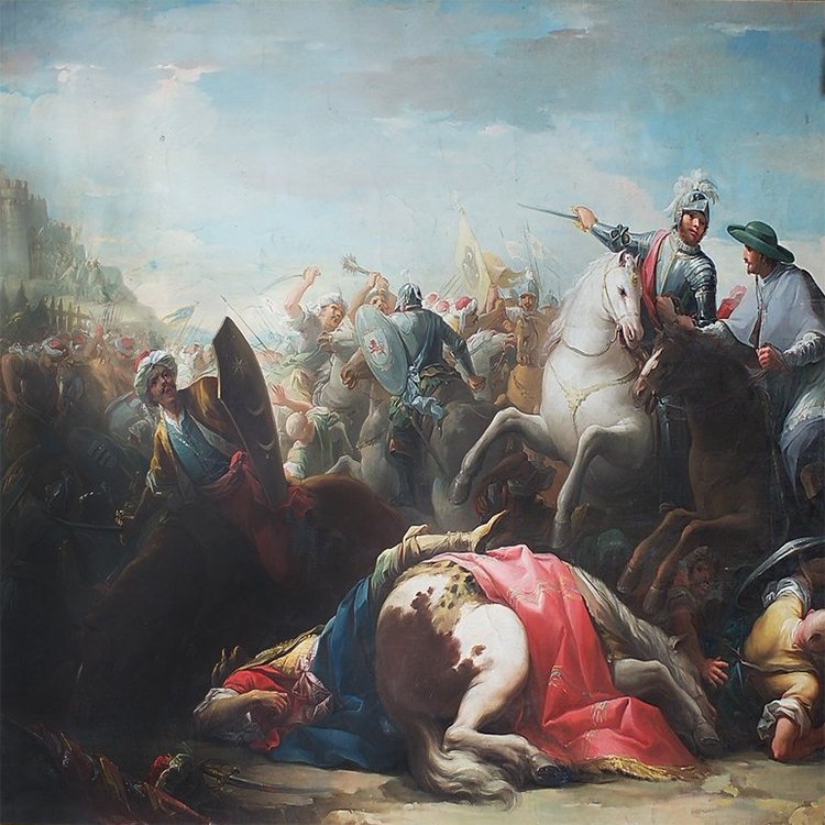 Artistic representation of the Battle of Salado, for which Yuçaf de Écija and other notable Jews contributed funds in support of the Christian king Alfonso XI. The image belongs to an 18th-century oil on canvas by Salvador Maella. The original is preserved in the Casita del Príncipe of the Monastery of El Escorial.