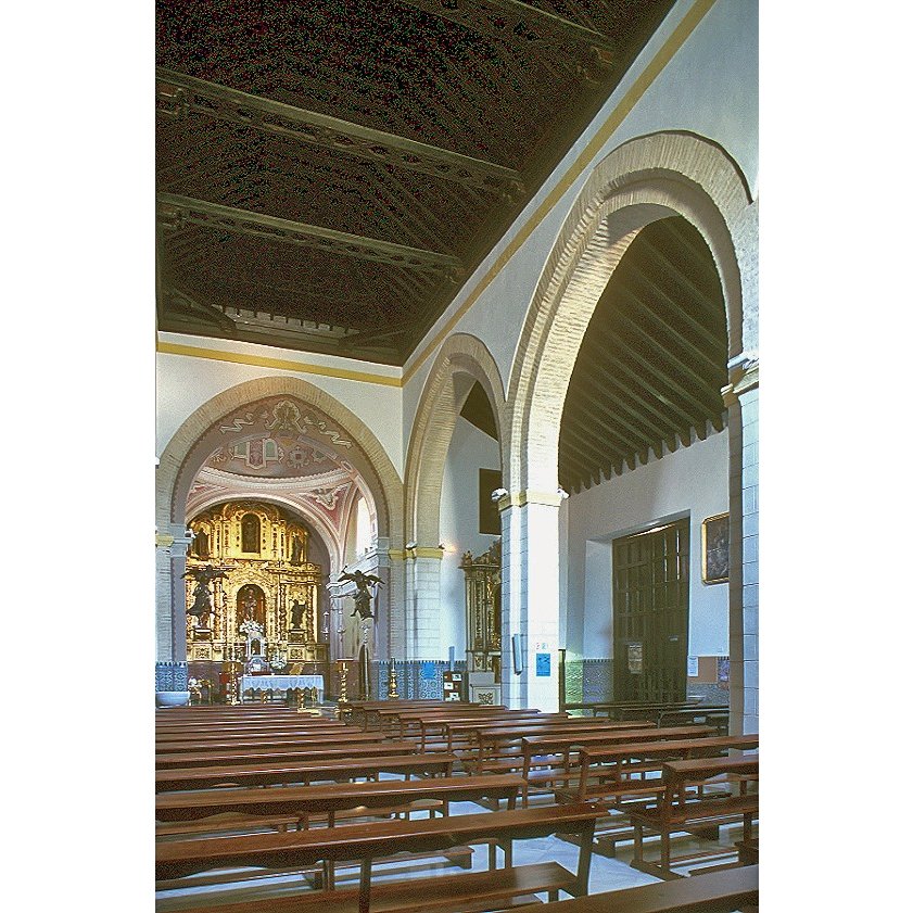En el interior encontramos el espacio dividido en tres naves, con la central más amplia y alta que las laterales. Separando las naves aparecen grandes arcos apuntados que descansan sobre pilares cruciformes. Otro gran arco apuntado separa la nave central del presbiterio a modo de arco triunfal. La mayor parte de los muros se hallan enfoscados en blanco, con la zona de los pilares imitando sillería y dejando en los arcos el ladrillo visto. Un  zócalo de azulejos del siglo XX con formas geométricas recorre todo el interior. La cubrición se hace mediante artesonados de madera de estilo neomudéjar, de par y nudillo en la nave central y de colgadizo en las laterales.