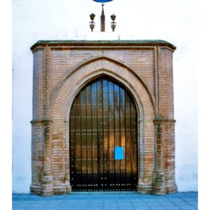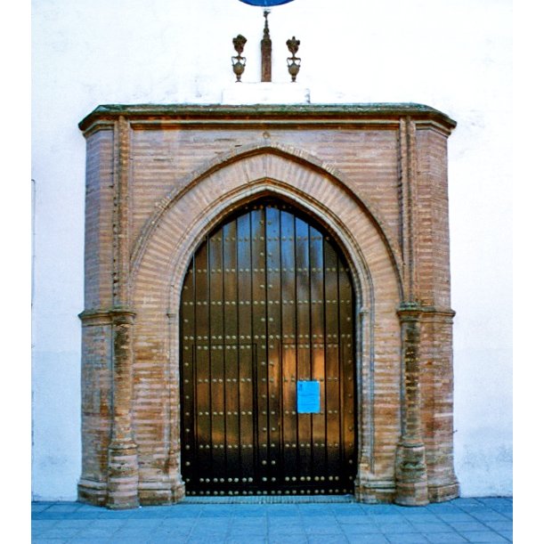La fachada principal es la que da al este, en los pies de la iglesia. En su centro encontramos una magnífica portada mudéjar realizada probablemente en el siglo XV. Está formada por un arco ojival, enmarcado por una estructura que sobresale del resto de la fachada, construida a base de hileras de ladrillos que alternan dos tonos. Es de una gran belleza a pesar de su sencillez y está claramente emparentada con otras portadas similares que encontramos en Sevilla, como la de la iglesia del convento de Santa Paula o la de la capilla de Santa María de Jesús. Sobre la portada encontramos el escudo de la Catedral, la Giralda entre dos jarras de azucenas, símbolo del patronazgo del cabildo catedralicio. Este emblema no aparece en el dibujo de Richard Ford de 1831, por lo que debió añadirse con posterioridad.