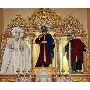 Como decíamos, en la cabecera de la nave izquierda se ubica la capilla sacramental, en la que reciben culto las imágenes titulares de la Hermandad de la Paz. La capilla se halla cubierta por una bóveda de arista con linterna en el centro y presidida por un retablo neobarroco. En el centro encontramos a Nuestro Padre Jesús de la Victoria, una talla realizada por Antonio Illanes Rodríguez en 1940. Forma parte de un paso en el que se ve a Jesús tomando la cruz para cargar con ella camino del Calvario, aunque cuando está en su capilla la imagen se muestra lógicamente sin la cruz. A la izquierda se sitúa la imagen de María Santísima de la Paz, realizada en 1939 también por Antonio Illanes, de quien se dice que se inspiró para el rostro de la imagen en los rasgos faciales de su esposa, Isabel Salcedo. A la hora de procesionar, la imagen destaca por los tonos blancos y plateados de su paso, tanto en el palio como en la figura de la Virgen en sí. Esta blancura es un claro signo de la advocación de la Paz y configura una estampa muy singular e icónica en la Semana Santa de Sevilla. El mismo autor realizó también la talla de San Juan que ocupa la hornacina de la derecha en el retablo.