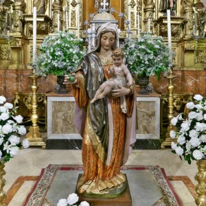El retablo es de estilo neobarroco, realizado en el siglo XX. Está dividido en tres calles y dos cuerpos horizontales. En la hornacina principal encontramos una magnífica talla de la Virgen con el Niño conocida como la Virgen del Prado. Fue realizada por Jerónimo Hernández hacia 1577 y es una destacada muestra de la escultura renacentista en la ciudad. El Niño Jesús aparece bendiciendo con un dulce gesto mientras que la Virgen sostiene una pera en su mano derecha. Hay que recordar que esta imagen ejercía como patrona y protectora de los hortelanos y gentes del campo en esta zona de Sevilla.