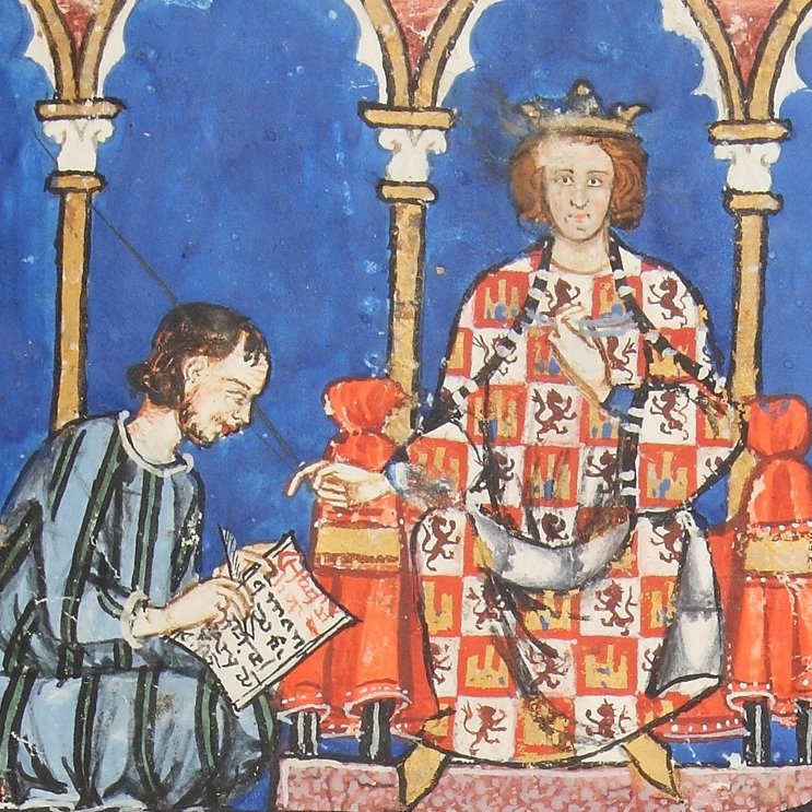 Imagen del rey Alfonso X dictando a un escribano en el folio 65 del "Libro de los juegos de Ajedrez, Dados y Tablas". Sevilla, 1283.