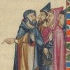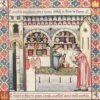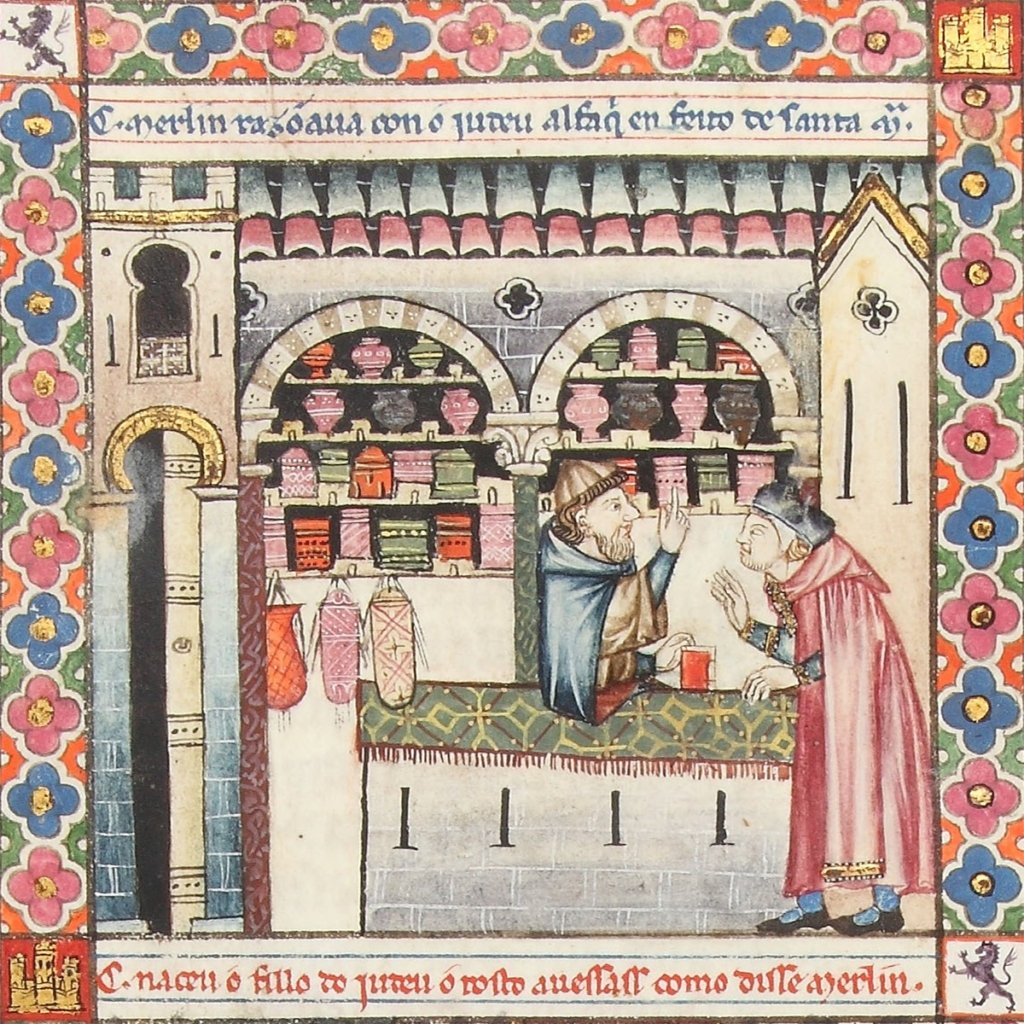 Escena de una botica judía (c. 1285). "Cántigas de Santa María. Códice Rico". Cántiga 108 (folio 155). Biblioteca del Monasterio de San Lorenzo de El Escorial