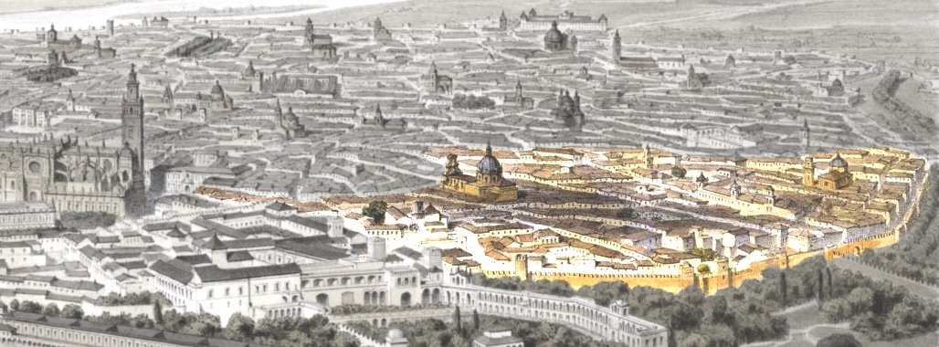 Área aproximada de la antigua judería de Sevilla sobre la litografía aérea de Alfred Guesdon (c. 1854)
