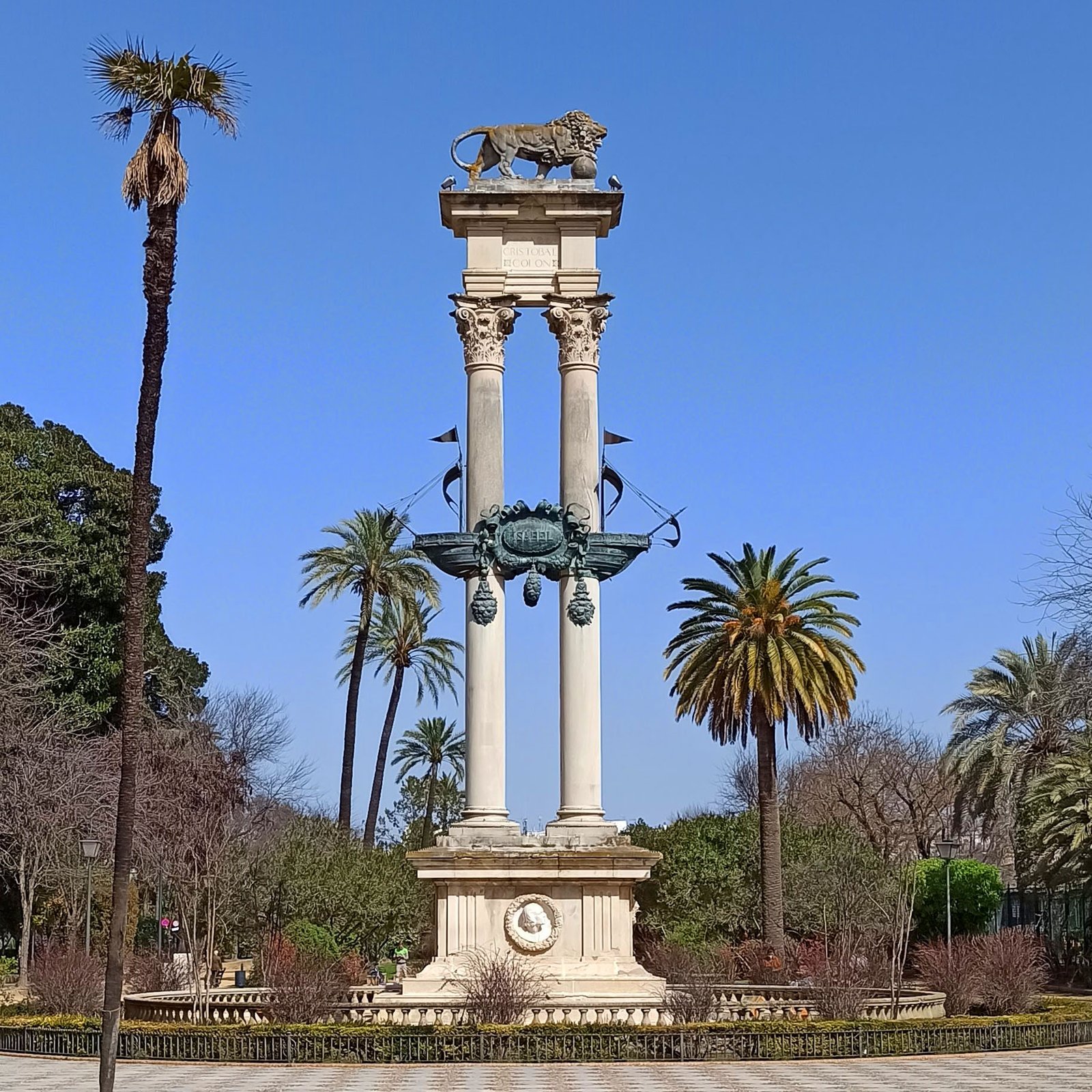 El monumento, que aporta el elemento vertical de compensación compositiva al paseo, fue diseñado por el arquitecto Talavera y ejecutado por el escultor Lorenzo Coullaut-Varela, y está dedicado a Cristóbal Colón, en consonancia con los eventos de la Exposición Iberoamericana de 1929, momento en que se realizó.