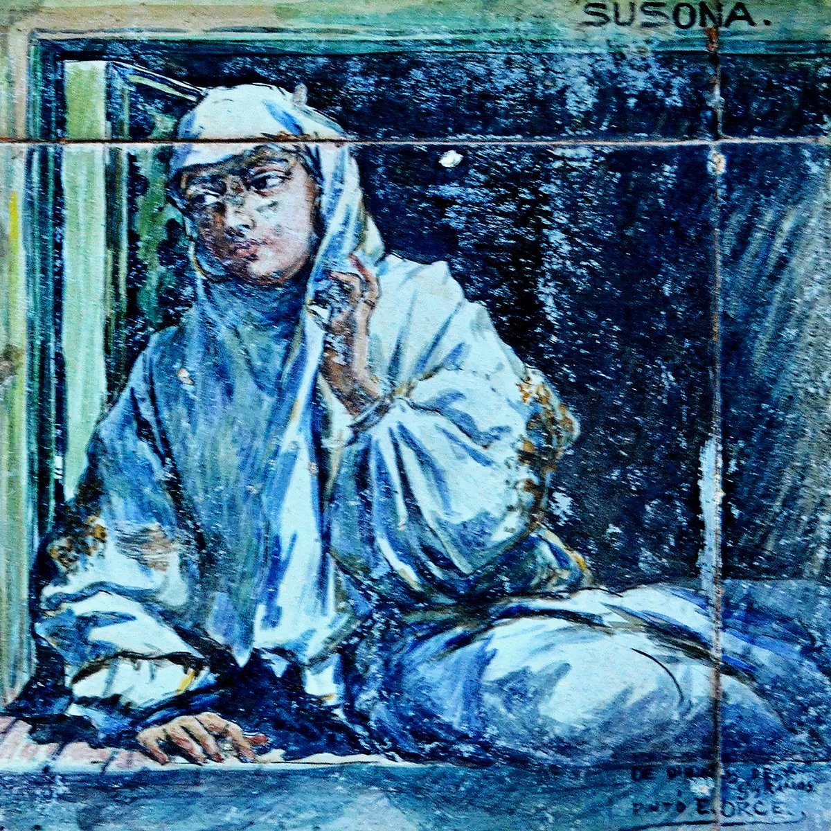Representación de la Susona en la decoración cerámica de la glorieta de Mas y Prat, en el Parque de María Luisa. Fue elaborada por Enrique Orce en la Fábrica de Manuel Ramos Rejano, tomando como modelo una pintura José García Ramos.
