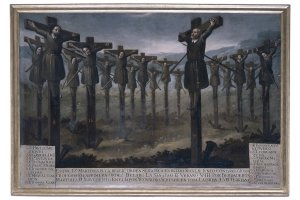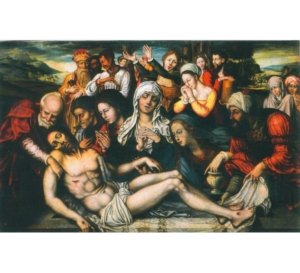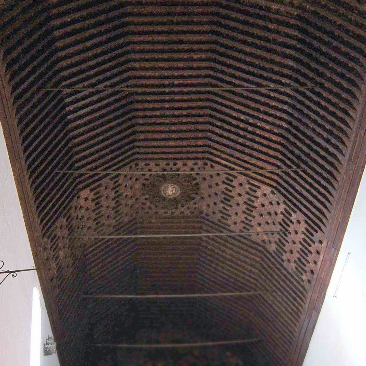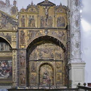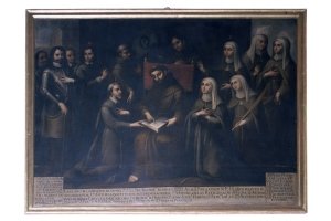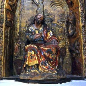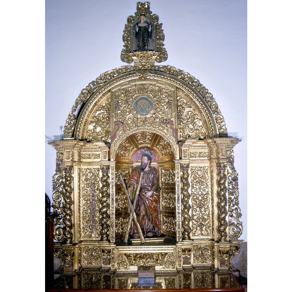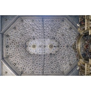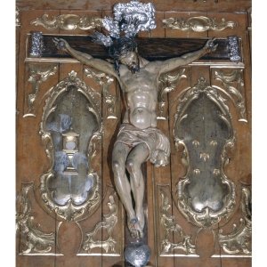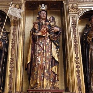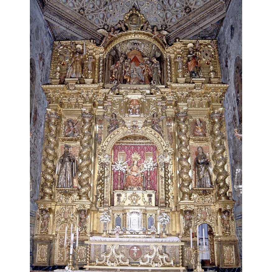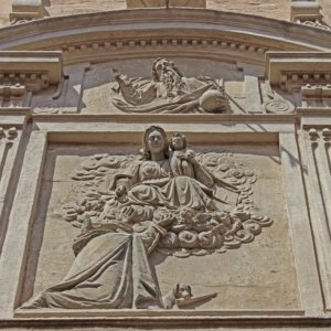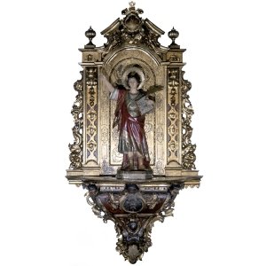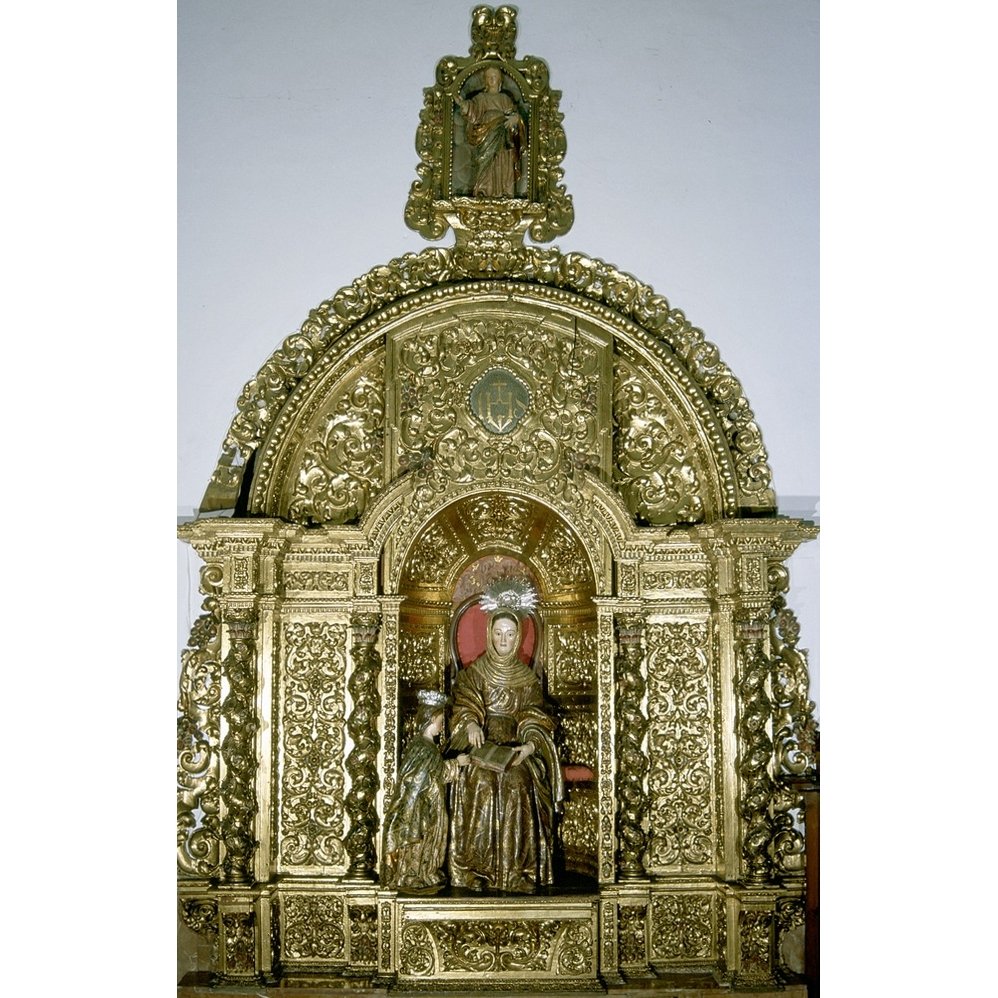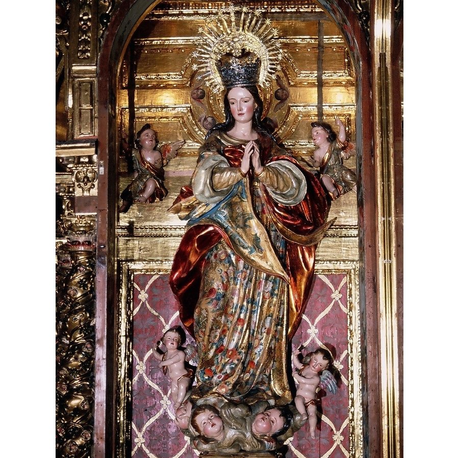 Coronando el conjunto, encontramos una escultura femenina que sostiene una corona de laurel en su mano derecha. Podría tratarse de la musa Calíope, protectora de la poesía épica y la elocuencia.