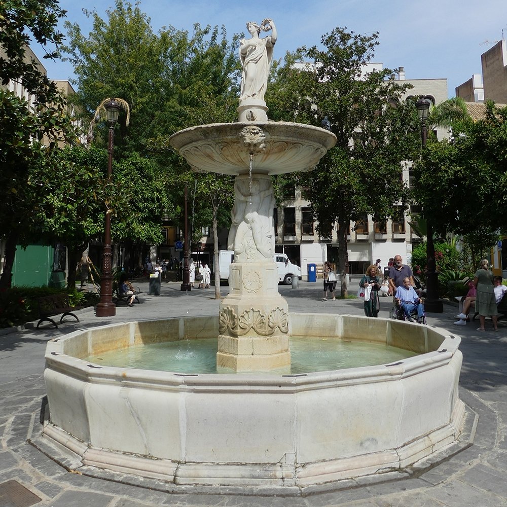 Por su parte, el primer cuerpo del fuste central y el vaso circular proceden de una fuente manierista que se ubicó en la Alameda en el siglo XVI. Por último, la escultura femenina que culmina el conjunto proviene de la colección de escultura del siglo XVIII que atesoraba el Palacio Arzobispal de Umbrete. Buena parte de las esculturas de esta colección se encuentran hoy decorando el Jardín de las Delicias, al sur de la ciudad.