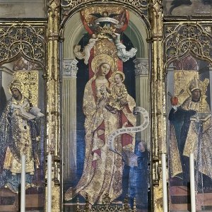El retablo mayor se realizó también a finales del XVII y es de una extraordinaria calidad. Cristóbal de Guadix fue su ensamblador y Pedro Roldán el imaginero, realizando todas las esculturas, con la excepción de la Virgen que ocupa la hornacina central que es posterior. El cuerpo central se divide en tres calles a través de cuatro espléndidas columnas salomónicas. A la izquierda encontramos a San Francisco y, sobre él, un busto de San Miguel. De forma paralela, a la derecha se sitúa Santa Clara y un busto de Santa Catalina. Cabe recordar que San Francisco es obviamente el fundador de la orden que lleva su nombre y Santa Clara la artífice de su rama femenina.